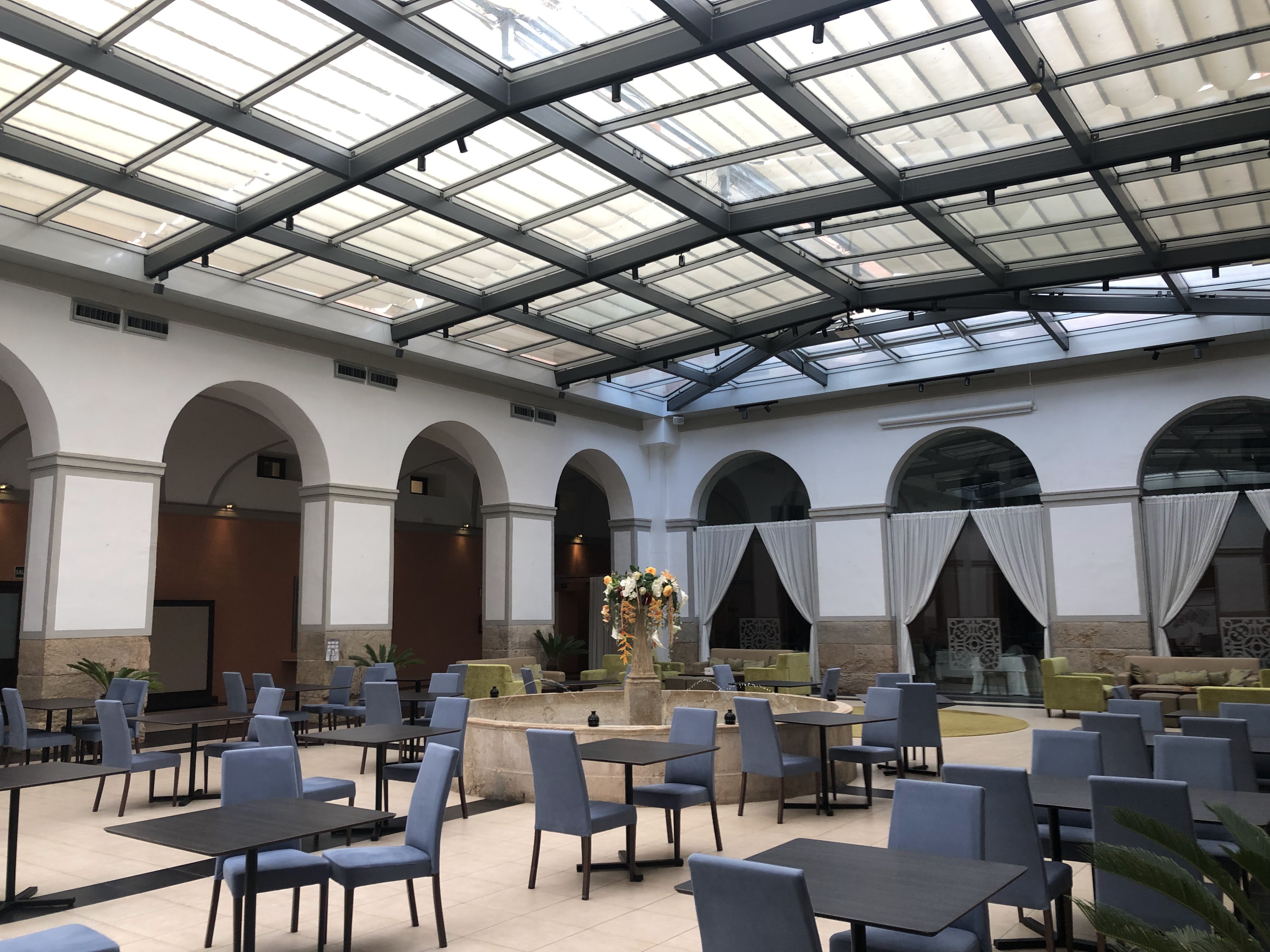 - Desayuno buffet muy correcto y restaurante María de Luna en el claustro del edificio.