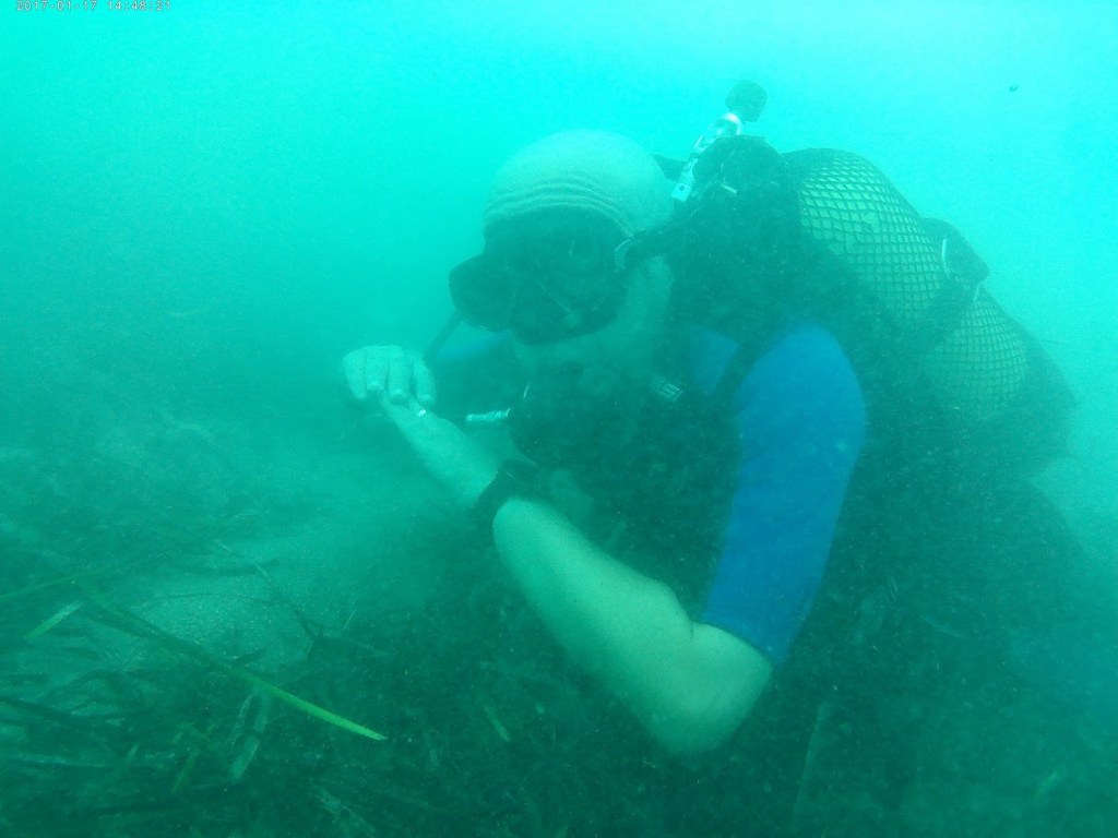 Primero bajamos a unos 2,5 metros de profundidad y una vez los nervios se han calmado, has practicado las señas de comunicación y ya eres capaz de respirar con normalidad volvimos a descender a una profundidad de entre 7 y 8 metros. Ahí ya me solté, cogí confianza y me dediqué a disfrutar, a ver los bancos de peces, las esponjas de mar, algún que otro pulpo en las rocas, y sobre todo la pradera de posidonia que le da al lugar un toque especial y cuyo movimiento o te hipnotiza o te hace pillar, por su movimiento, un mareo de manual que te puede obligar incluso a subir a la superficie.