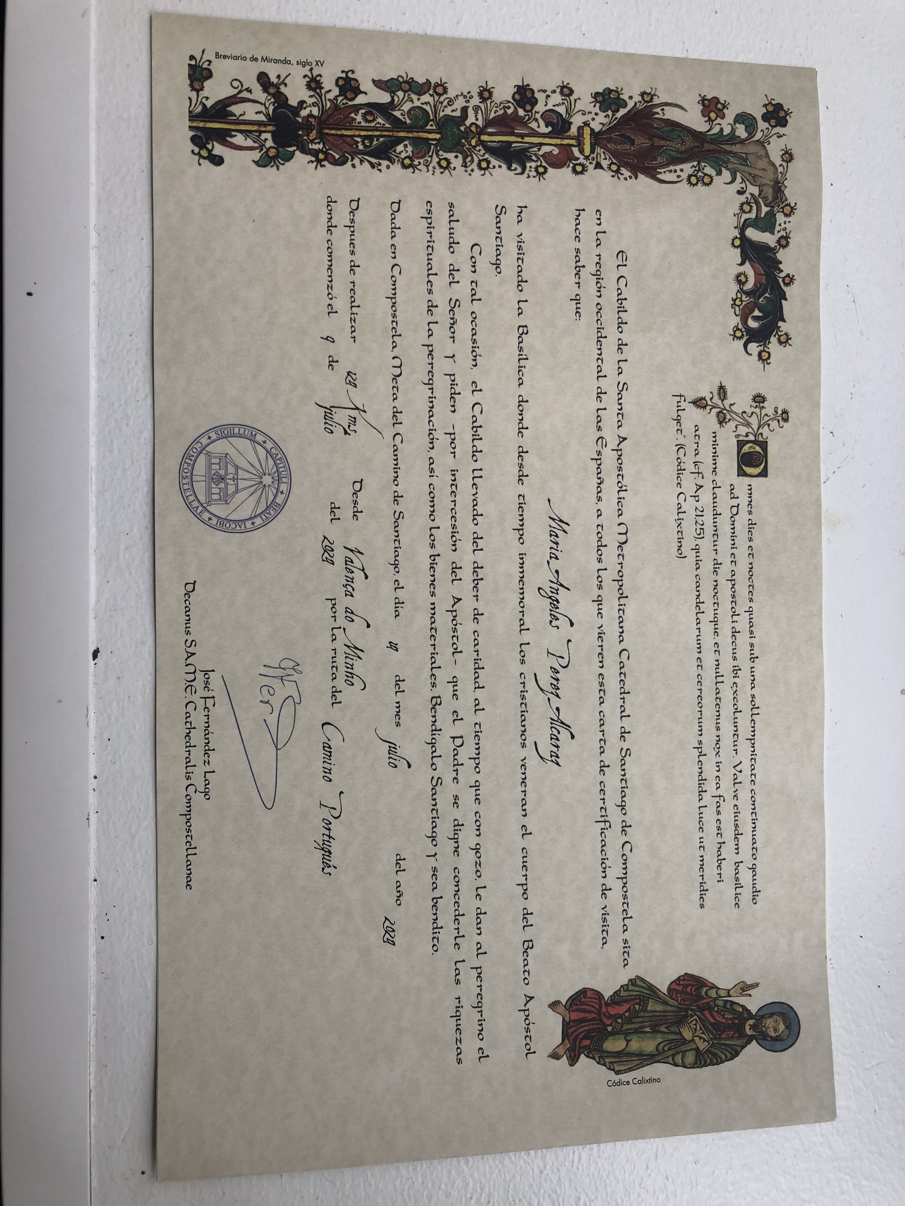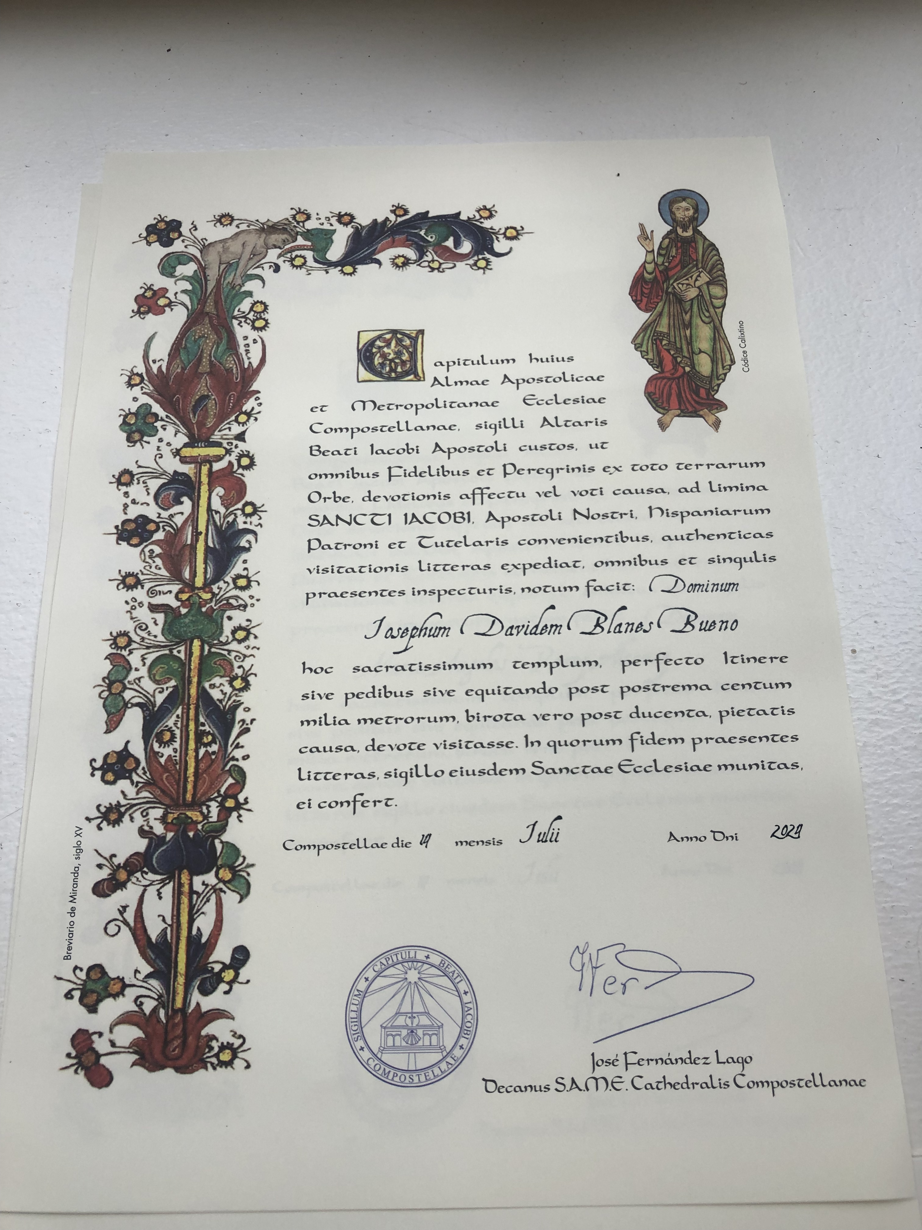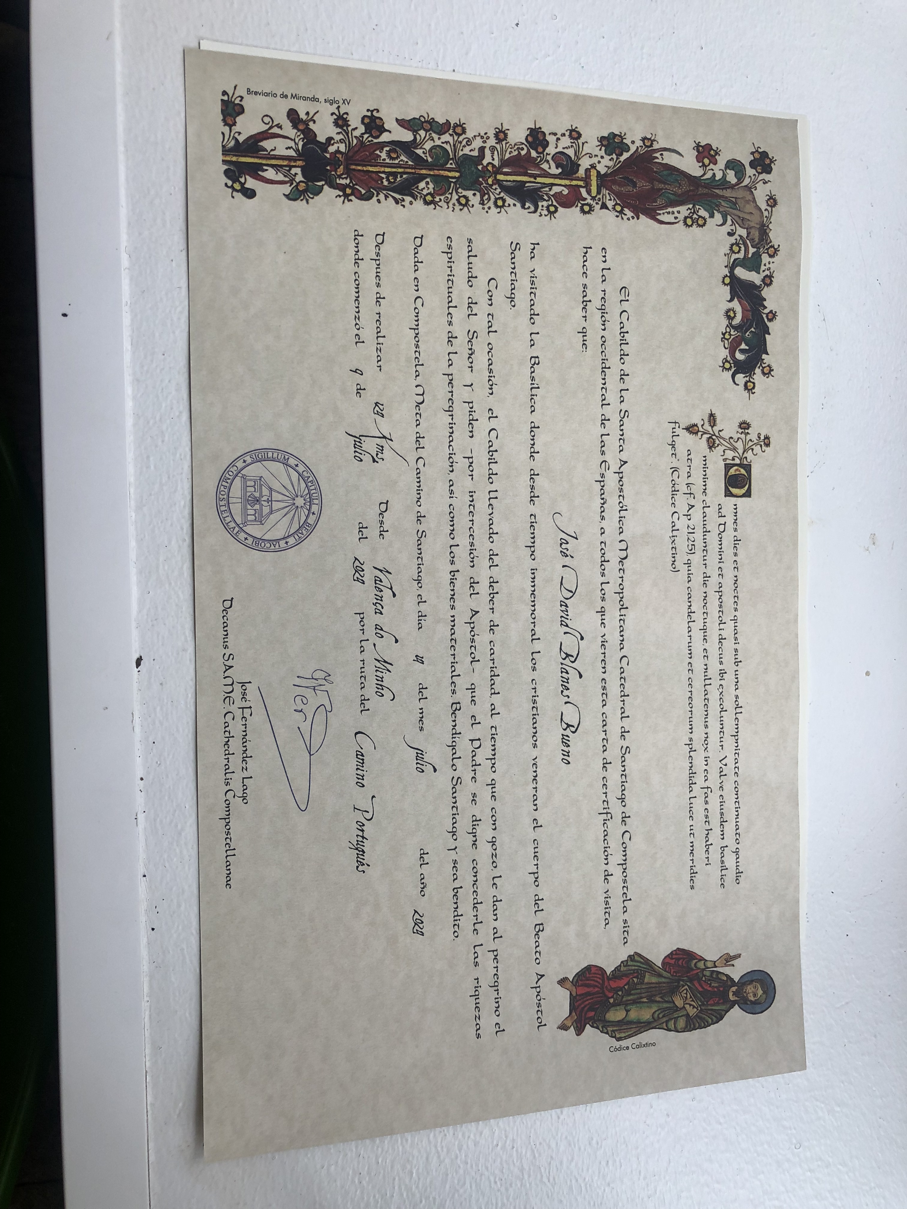Toca ahora llegar hasta la oficina de atención al peregrino, con la credencial en la mano para que comprueben que efectivamente se han hecho mínimo 100 kilómetros a pie para que te sellen por última vez la credencial y te den la Compostela, (que no la Compostelana como dicen algunos), el papel que certifica que has hecho el Camino de Santiago. Es un momento muy bonito cuando ves tu nombre escrito en latín y el reconocimiento, de alguna manera, a tanto esfuerzo.