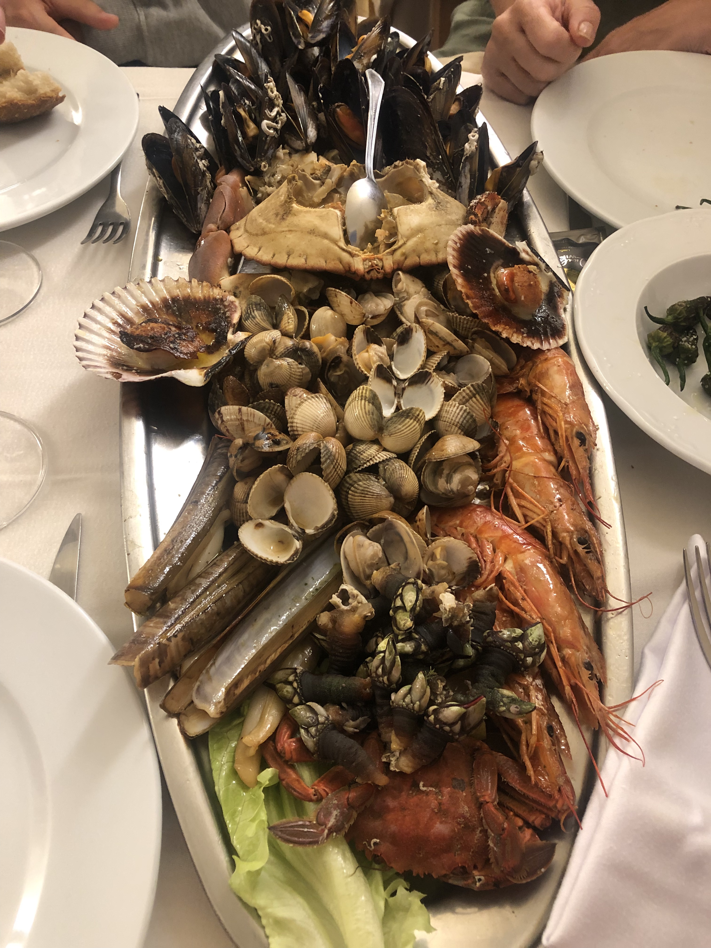 Casi las 5 de la tarde, después de 28’8 kilómetros finales, (al final fueron un total de 135 kilómetros recorridos), y tocaba comer. Gracias a que un buen restaurante junto a la oficina de atención al peregrino, (Milongas Tapería), nos atendió estupendamente y nos sirvió una muy buena comida acompañada de marisco y vino blanco.