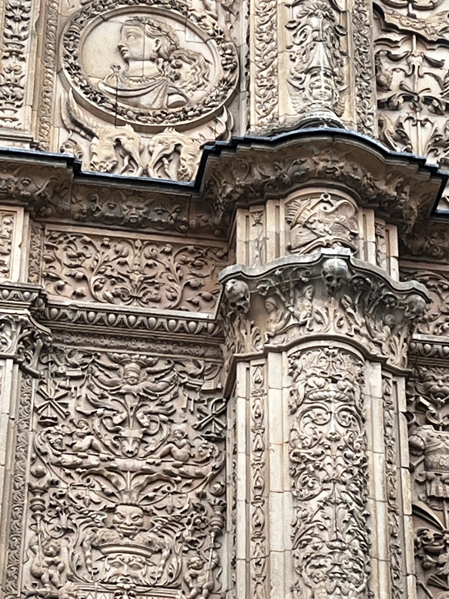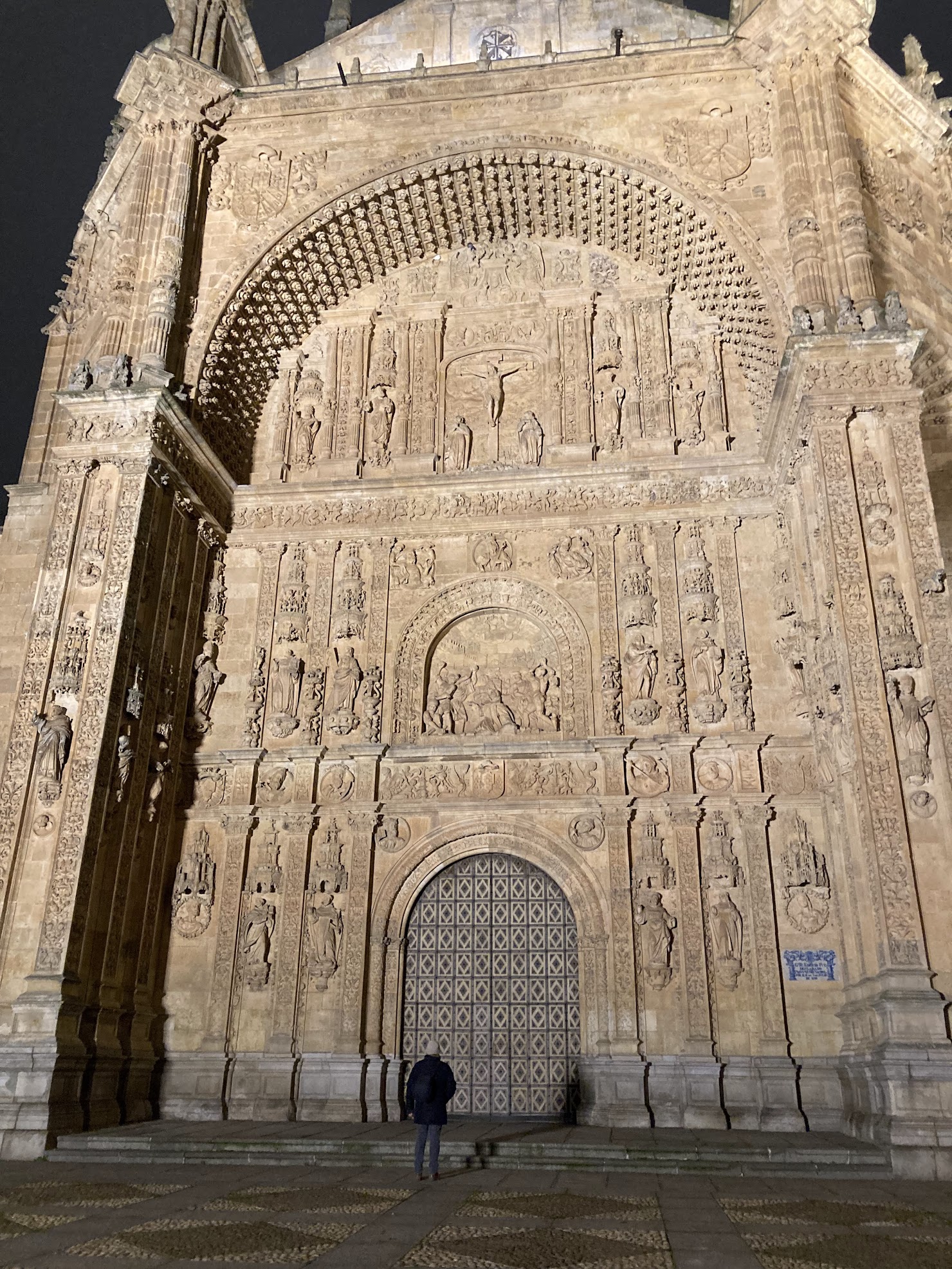 Finalizada esta primera visita nos encaminamos hacia la Catedral de Salamanca. Indicar que hay dos catedrales en la ciudad, la nueva de estilo gótico y cuya construcción se inició en 1513 y la catedral vieja de estilo románico que empezó a construirse en el primer tercio del siglo XIII, y ambas catedrales están pegadas una a la otra con accesos desde el interior. Que en su día no derribaran la catedral vieja para construir la nueva es algo que se agradece cuando se hace la visita. Es entonces cuando se puede observar con claridad las diferencias en las construcciones y sobre todo las diferencias de estilo. Cuando vayáis a visitar la Catedral nueva de Salamanca no dejéis de buscar al astronauta que está tallado en piedra en alguna parte de la fachada principal. Y no, no es que los canteros del siglo XVI tuvieran visiones futuristas o que la Catedral fuera construida por seres de otros planetas. Tampoco vamos a ser nosotros quienes develemos el misterio.