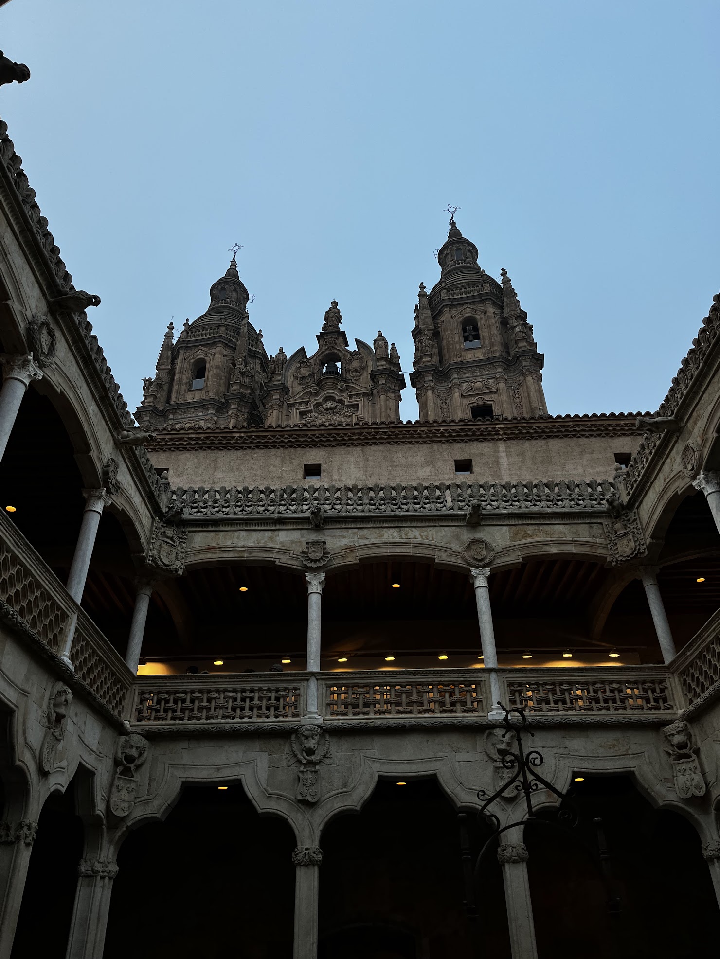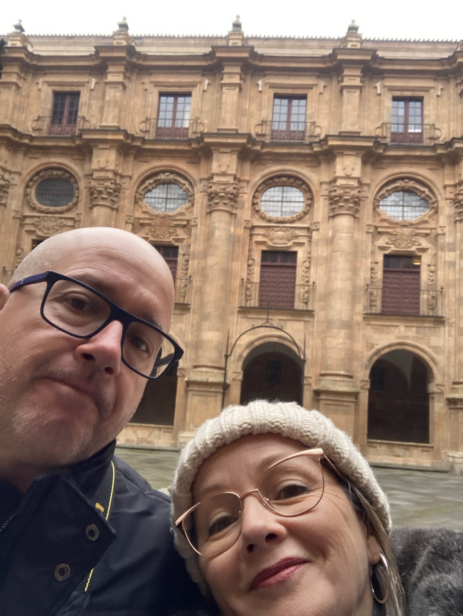 Teníamos por delante un largo día repleto de visitas y de kilómetros que andar, así que muy temprano bajamos al comedor del hotel a desayunar y pocos minutos después de las 9 de la mañana estábamos ya en la calle bien abrigados pues la temperatura a esas horas no era mayor de 1ºC. Lo primero fue ir a visitar la Universidad Pontificia de Salamanca, cuya obra fue iniciada en el año 1611 y tardó 150 años en ser terminada. Dado que se trataba de una visita guiada y todavía nos quedaba un poco de tiempo por delante decidimos subir a las Torres de Clerecía, escalones y más escalones para subir a lo alto de ambas torres desde se tiene una vista privilegiada de la ciudad. Después de bajar de las torres un extenso recorrido por dependencias de la Universidad con una explicación muy amplia de la historia de la misma. Destacar en la visita el patio de los estudiantes y el Aula Magna.