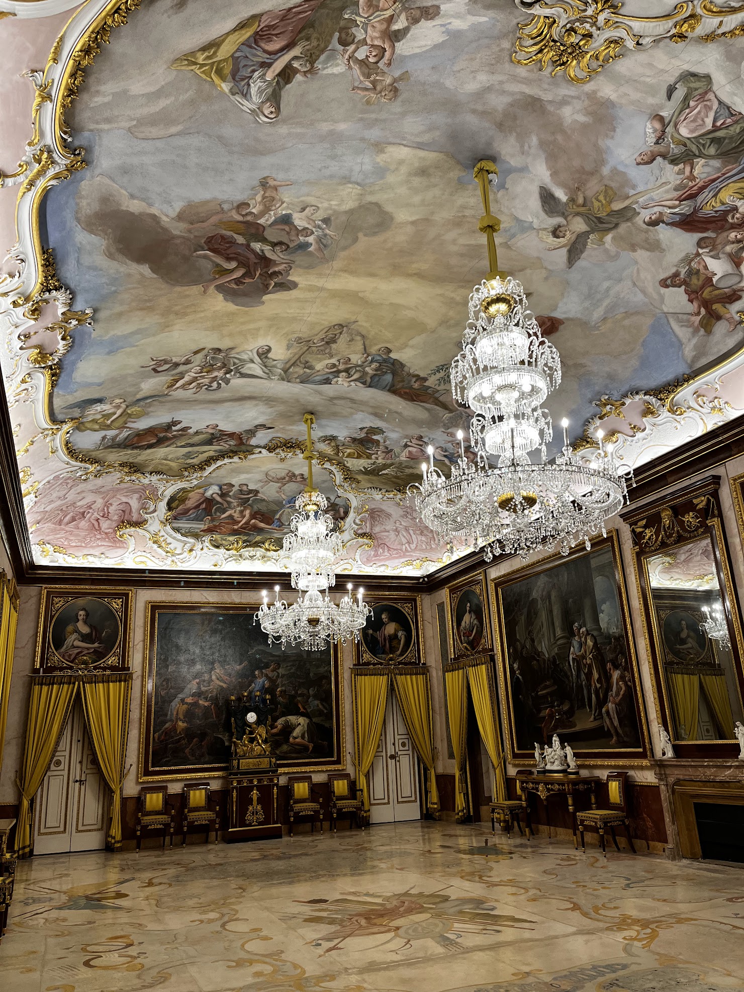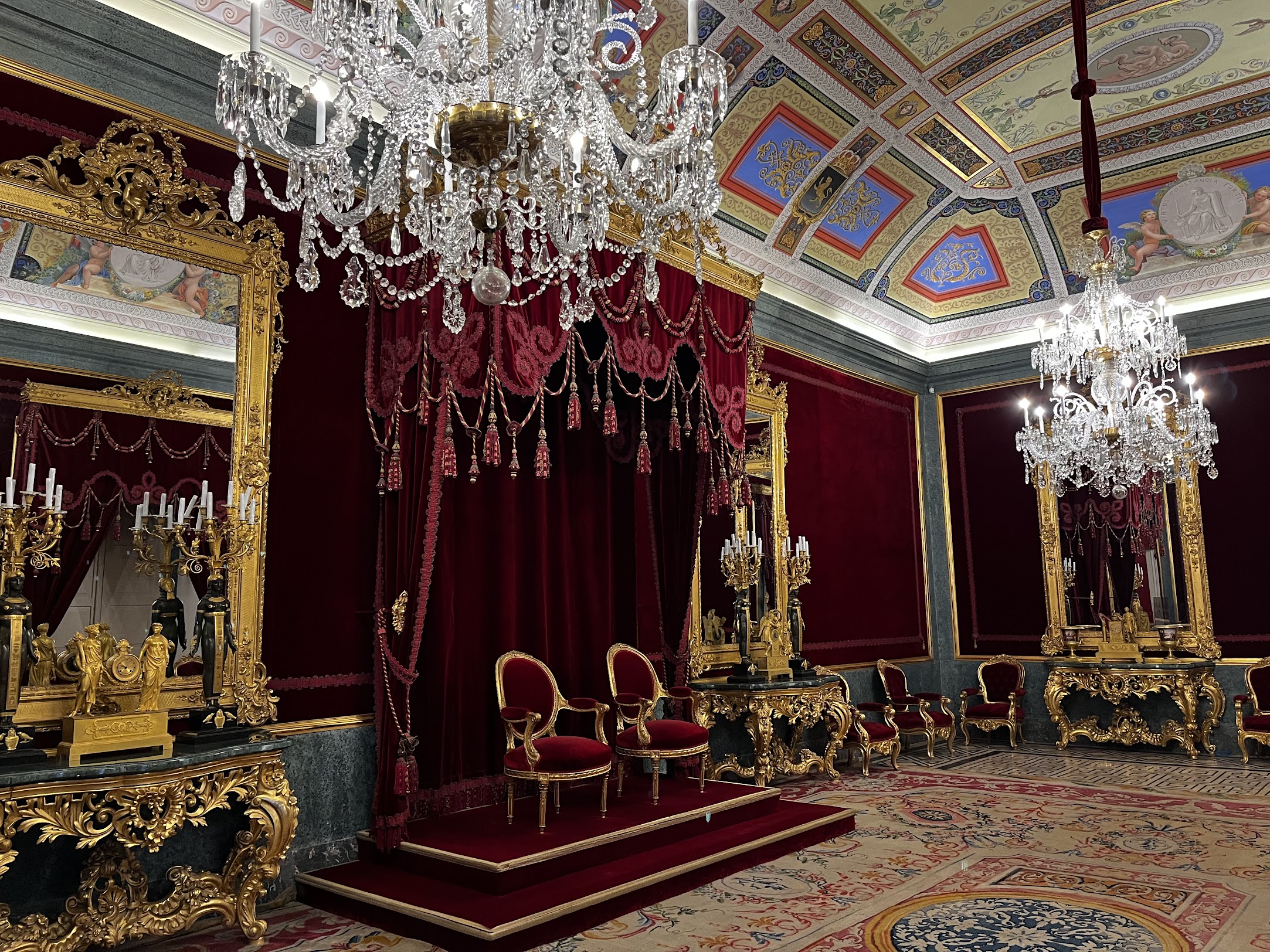 En fin, poco después de las dos de la tarde conseguimos entrar a nuestra habitación, dejar las maletas y enseguida nos dirigimos al Palacio Real de Aranjuez. En la taquilla de recepción del Palacio compramos las entradas para una visita guiada, (así nos lo recomendó la persona que nos atendió, ya que con este pase se visitaban 5 estancias que de otra manera no se podían ver), y a las 15’00h daba inicio la visita que duró poco más de 90 minutos y en el que una guía de Patrimonio Nacional nos explicó con todo lujo de detalles la historia de cada una de las estancias que íbamos visitando. Hay que reconocer que todas las instalaciones y estancias de Palacio que pudimos visitar están perfectamente conservadas, lo cual se agradece enormemente tratándose en muchas ocasiones de objetos de más de 300 y 400 años de antigüedad, (mobiliario, telas, vestidos, carruajes, embarcaciones, etc., etc.).