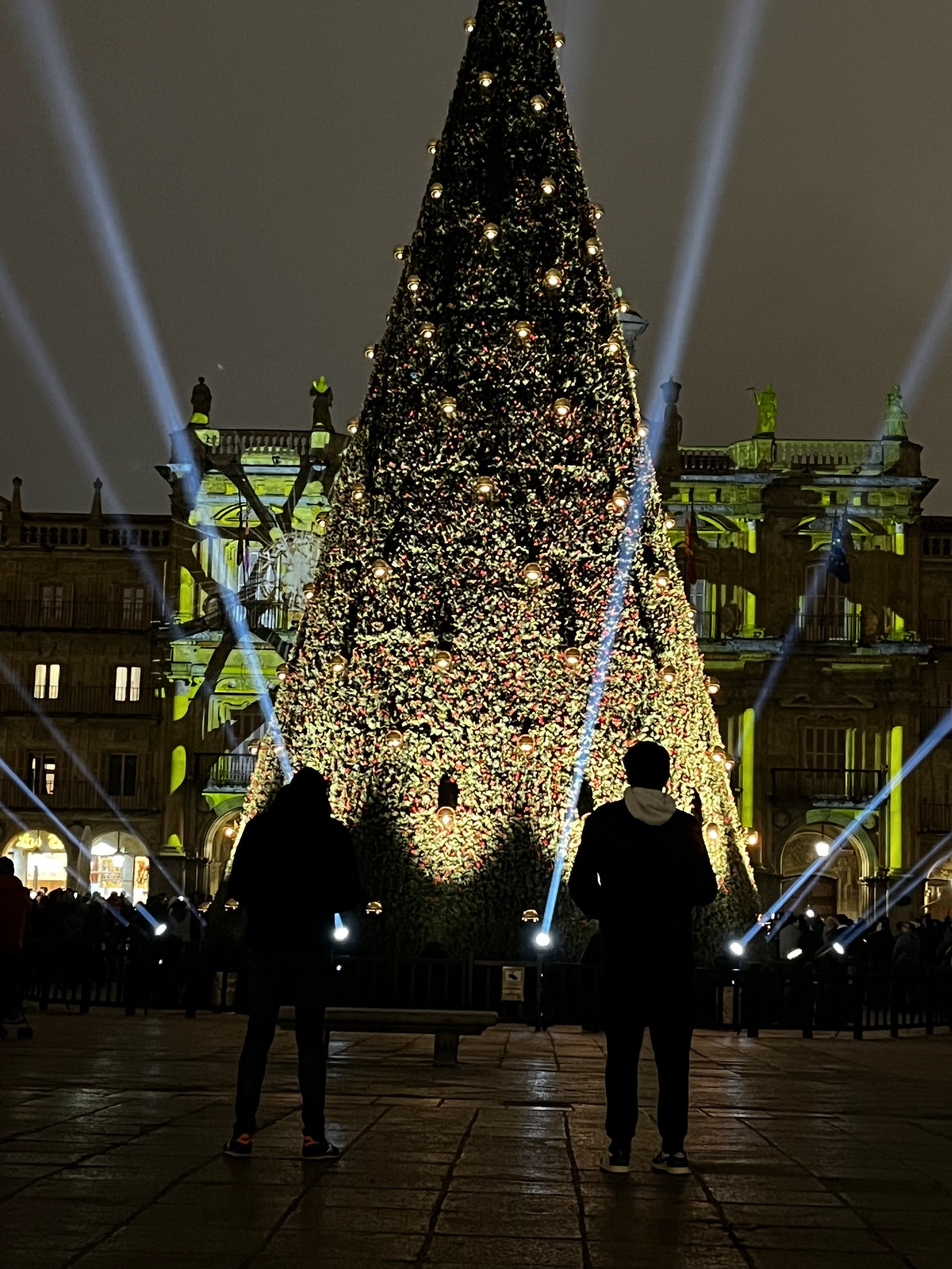 Eran casi las 8 de la tarde y en la Plaza Mayor , ahora en época navideña, se realiza un espectáculo de luz y sonido que no hay que perderse ya que es muy muy impresionante, proyectando luz a las cuatro fachadas de la plaza así como al árbol de navidad instalado en el centro de la misma.