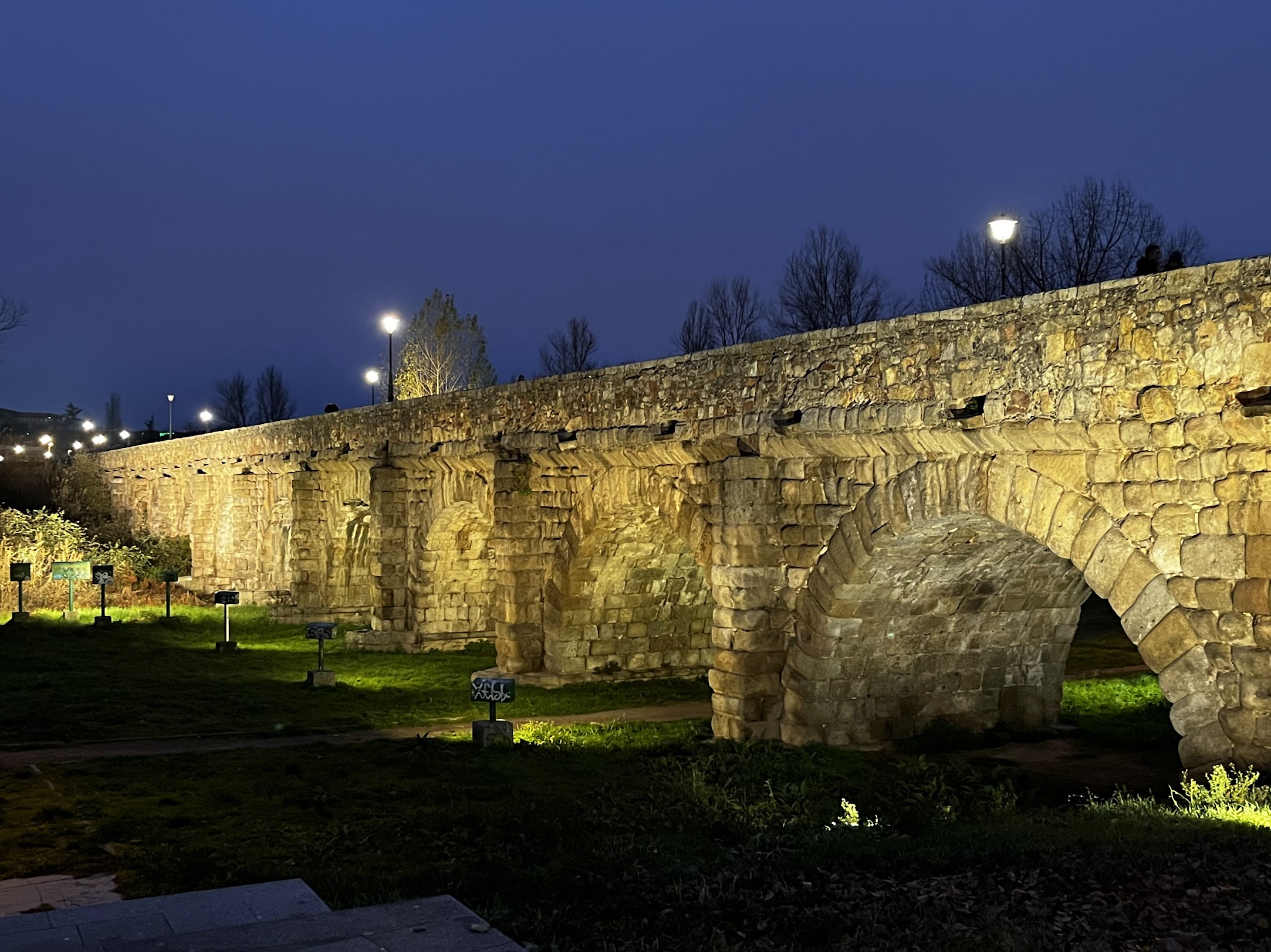 De ahí nos encaminamos a ver iluminado el puente romano de la ciudad y de nuevo de vuelta a la Plaza Mayor, no sin antes encargar para llevarnos de vuelta a casa el día siguiente dos buenos hornazos, (manjar típico de Salamanca). Por último, después de una cola de unos 45 minutos aproximadamente, entramos a ver el Huerto de Calixto y Melibea. Se trata de un jardín de 2.500 metros cuadrados ubicado en la ladera de la antigua muralla salmantina y que se denomina así por estar inspirado en el famoso jardín de la tragicomedia de Fernando de Rojas, la Tragicomedia de Calisto y Melibea, (publicada en 1502). Actualmente es un parque visitable de carácter romántico, y en época navideña solo se puede visitar a partir de las 18h, (cuando ya anochece), ya que está especialmente iluminado y con figuras de animales iluminadas desde su interior escondidas entre los árboles y arbustos del jardín. La entrada al jardín es gratuita.