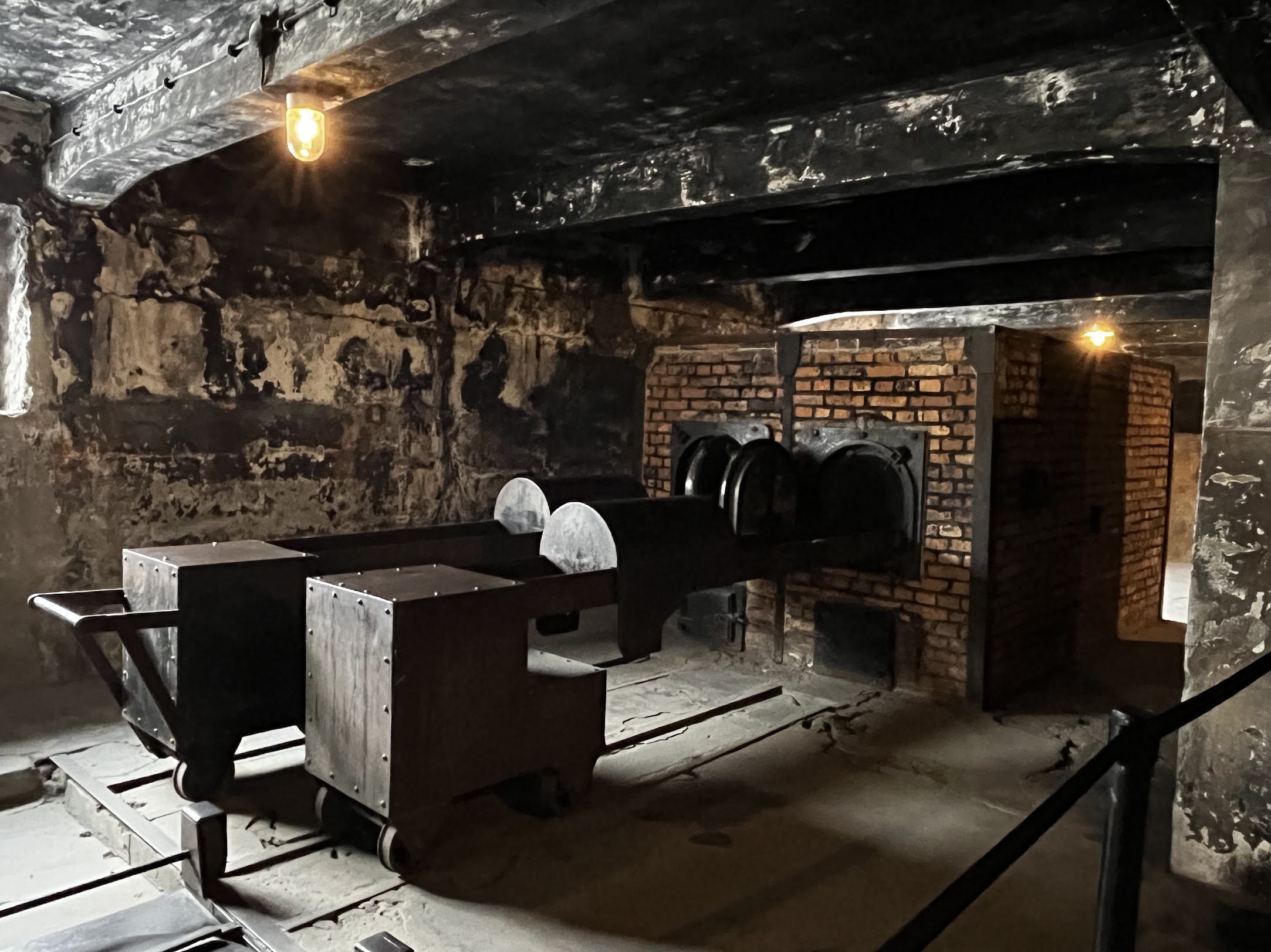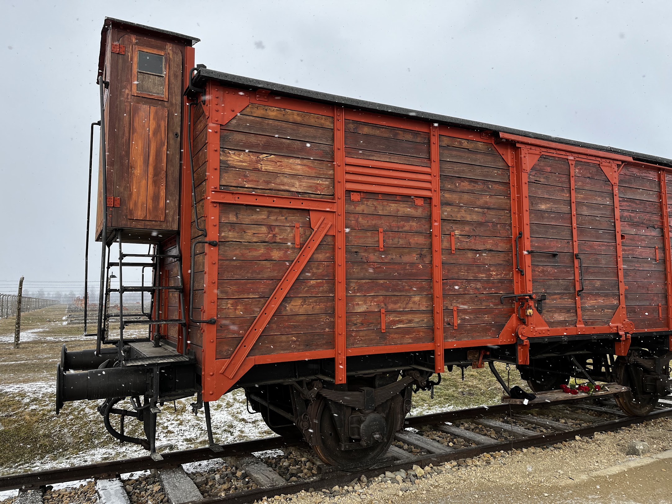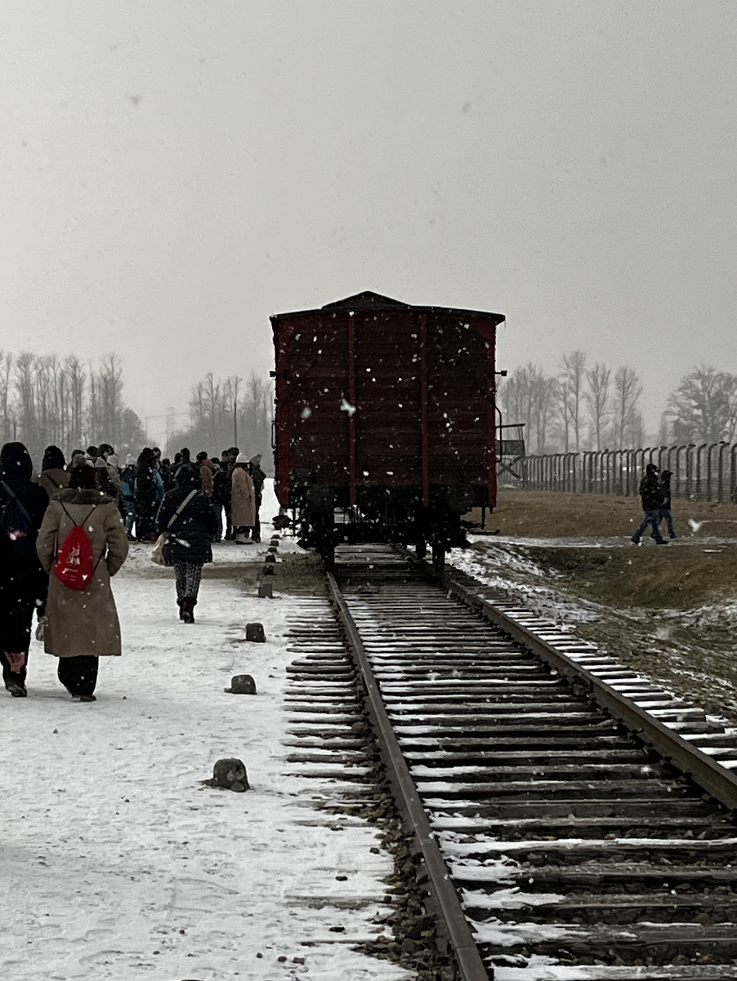 Terminada la visita nos dirigimos hasta el autobús que nos iba a llevar, a unos tres kilómetros de distancia, al campo de Birkenau o también conocido como Auschwitz II. Ya nos advirtió el guía que allí había un microclima especial y no nos engañó. Al llegar a Birkenau el cielo era oscuro e incluso nevaba copiosamente en algunos instantes. El guía nos dijo que en estos momentos no hacía frío en el campo teniendo en cuenta que hace 80 años las temperaturas alcanzaban en invierno los 20, 30 e incluso los 40 grados bajo cero y con más de un metro de nieve, (los presos vestían una camisa y un pantalón de tela y unos zuecos de madera, únicamente). Impresiona mucho ver las vías de tren que llegan y atraviesan el edificio de entrada. Impresiona mucho ver uno de los vagones reconstruidos en el que se transportaba a los presos, (vagones construidos para el transporte de ganado), que todavía está situado en las vías justo en la plataforma en la que los médicos de las SS seleccionaban a las personas aptas para el trabajo y descartaban y mandaban a las cámaras de gas al resto. Siguiendo las vías del tren se llega hasta los restos de una de las cámaras de gas medio derruida de las seis que habían dentro del campo. Pudimos entrar en uno de los barracones de la parte del campo destinado a las mujeres y solo imaginar las condiciones de «vida» de aquellas pobres personas se nos ponía un nudo en la garganta, (múltiples enfermedades simultáneamente, insectos, roedores, excrementos, alimentación escasa o nula, frío o calor extremos, hacinamiento, 10 o más horas de trabajos forzados, castigos físicos, torturas físicas y psicológicas, violaciones, asesinatos, etc., etc., etc.). Indicar que en este mismo campo realizaba sus experimentos mortales con prisioneros el conocido como «Ángel de la Muerte», el oficial alemán de las SS, médico, criminal de guerra y asesino Josef Mengele.