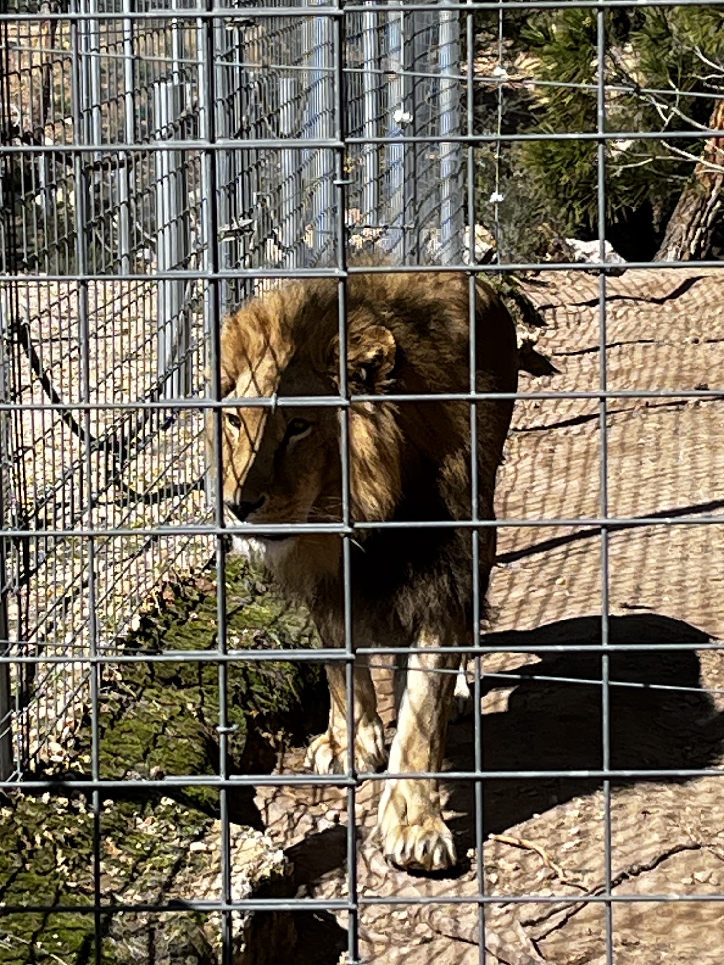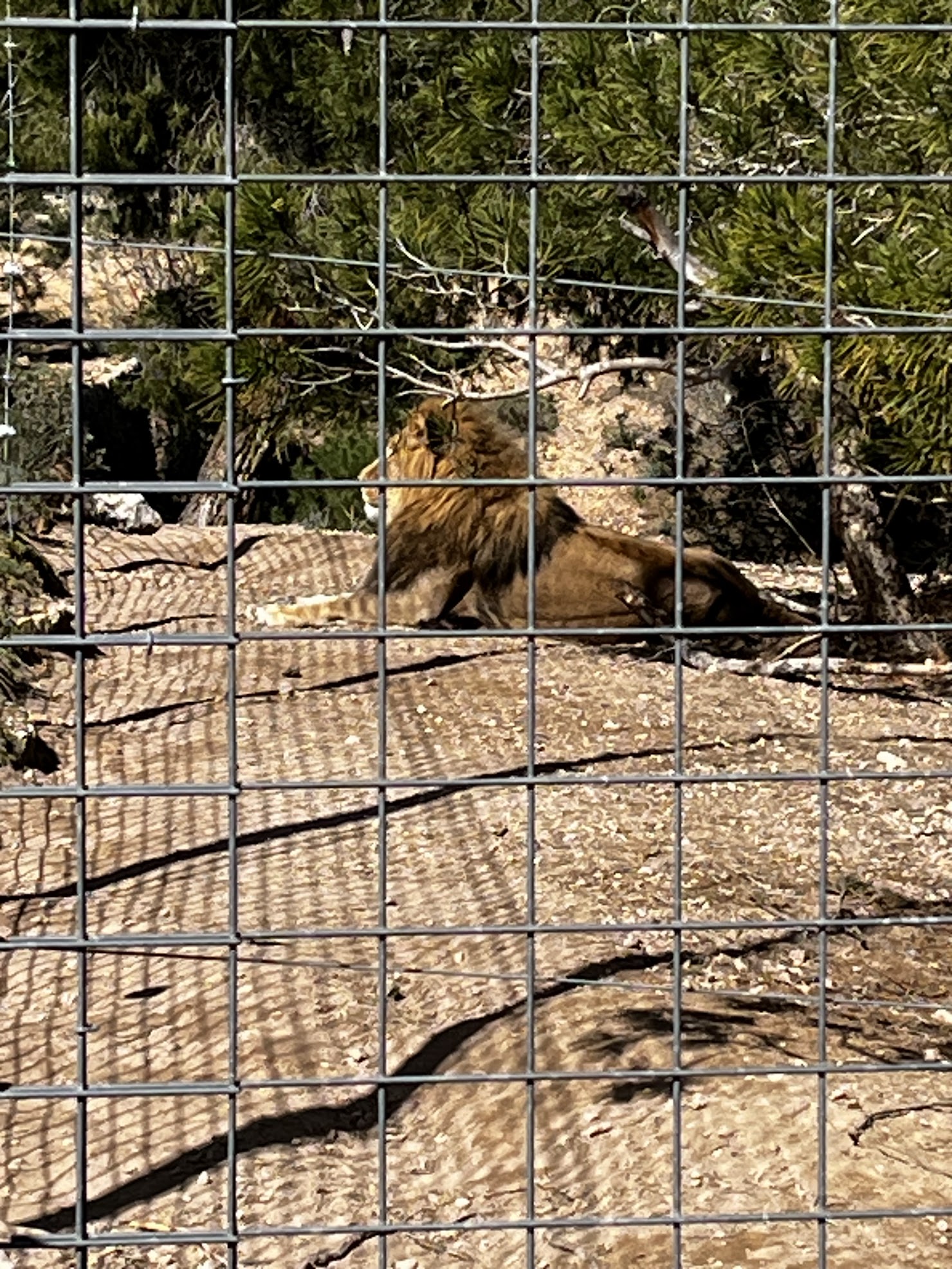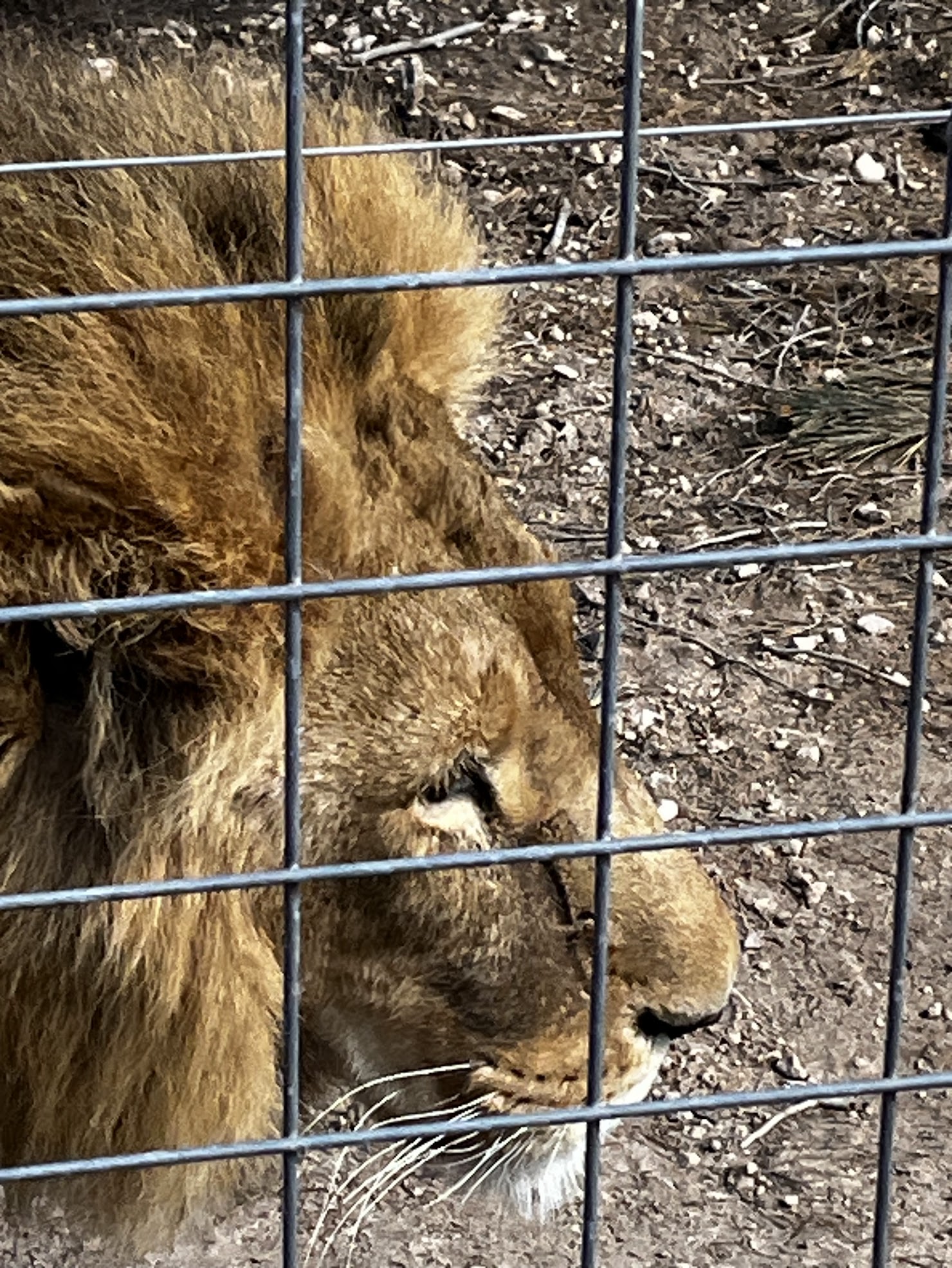 Un poco más alejado estaba Ruru. Un león sin melena debido a que su anterior dueño lo castró, dejándolo sin testosterona que es lo que hace que les crezca la melena. Ruru fue rescatado de la guerra de Ucrania y llegó a Villena en 2022.