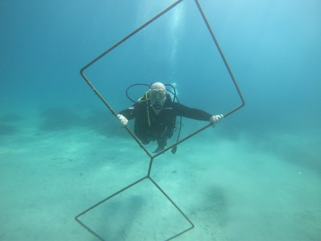 Después de casi una hora de explicaciones y una vez equipados nos metimos en el agua. Dentro del mar nos pusimos las aletas y empezamos en primer lugar, sin sumergirnos, a aprender a respirar y a aprender a movernos en el agua con un equipo de buceo que viene a pesar entre 12 y 16 kilos, y sobre todo a controlar la respiración y los nervios. Teniendo apenas el agua por la cintura y sumergiendo un poco la cabeza ya podíamos observar los bancos de peces que nadaban a nuestro alrededor, presagio de las maravillosas imágenes que veríamos una vez sumergidos. Cuando ya estábamos listos poco a poco fuimos descendiendo, cerca del espigón que nos protegía del ya de por sí poco oleaje, y allí, a unos 7 u 8 metros de profundidad, nuestros ojos descubrieron otro mundo maravilloso. Bancos de peces a nuestro alrededor y nosotros nadando junto a ellos, estrellas de mar, pequeños pulpos, una paleta de vivos colores, cientos de plantas marinas, campos de posidonia y un color azul turquesa intenso cuando uno dirigía la vista hacia el fondo, y hasta un pecio hundido a pocos metros de la costa que esta vez pudimos ir a ver, (yo ya pensaba que era un mito de las veces que me habían dicho que allí había un barco hundido). Si a todo lo anterior le añadimos los sonidos y la sensación de ingravidez esta experiencia se convierte en algo único.