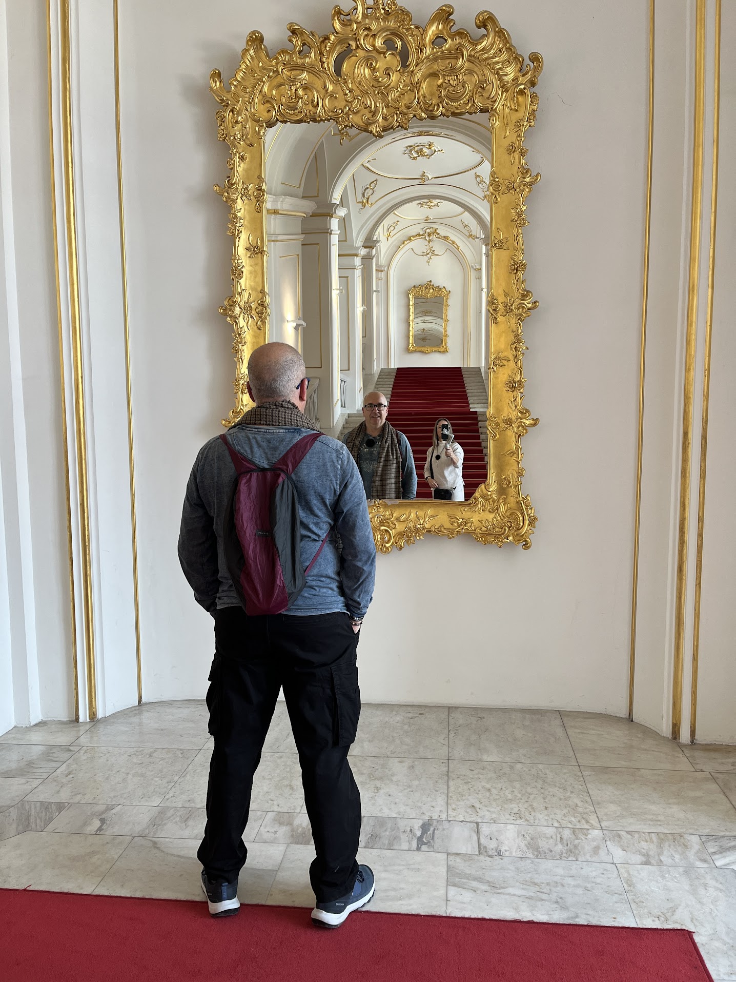 Con la barriga bien llena y ya a punto de anochecer decidimos tomar café fuera del restaurante, habíamos localizado una cafetería/pastelería bellísima y nos fuimos a por ella. El lugar se llama Konditorei Kormuth. El interior está decorado, (paredes y techos), con frescos renacentistas y exhibe antigüedades de los siglos XVI al XIX. El personal viste trajes tradicionales, mesas de forja y mármol rosa y los platos se sirven en fina porcelana china. Cafés, chocolates, tartas deliciosas y una consumición mínima por persona de 13.-€. ¿Caro?, tal vez sí, pero merece la pena y además uno de los camareros hablaba español ya que había estado estudiando en México.