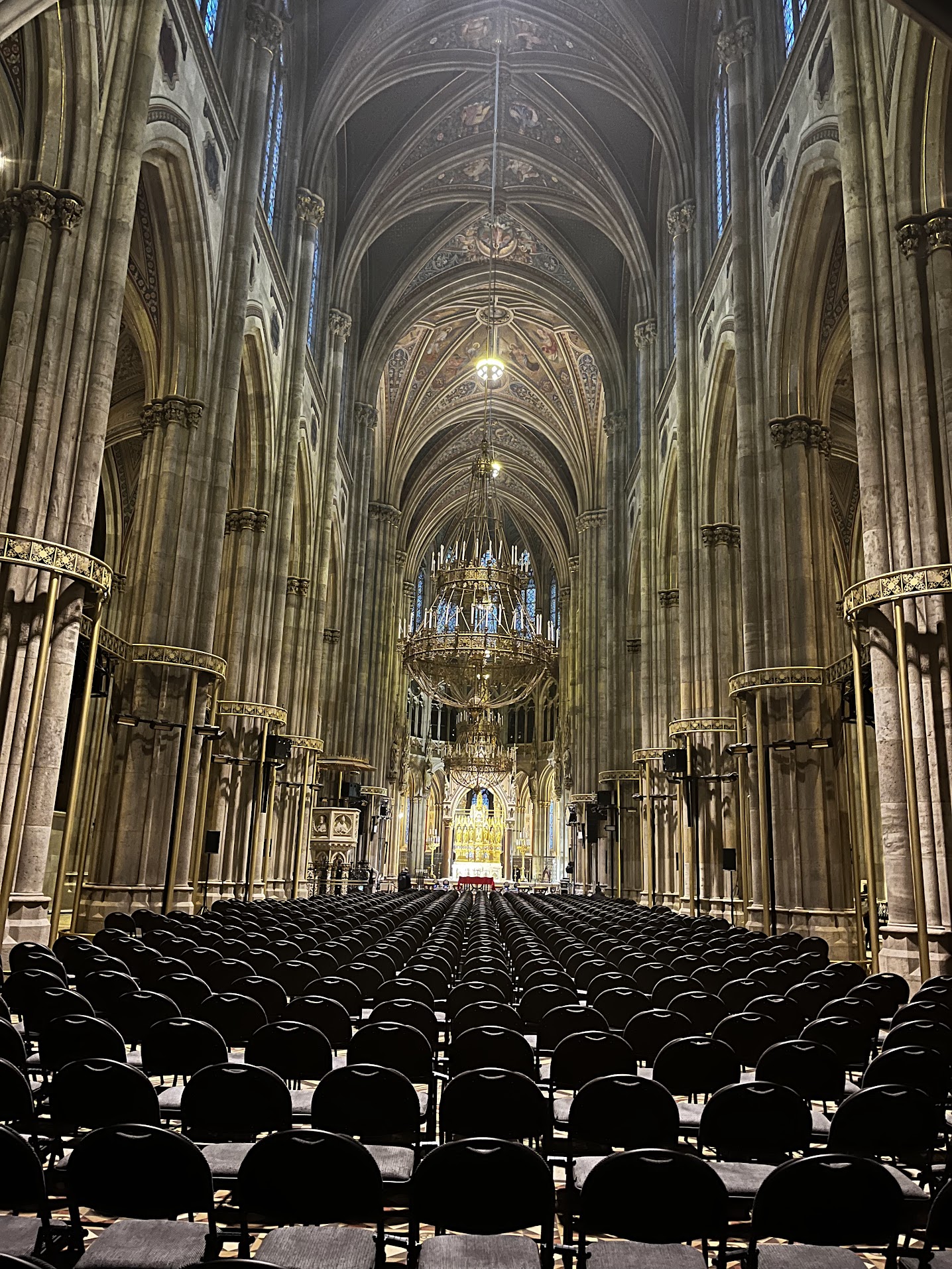 Y de repente, volvía a ser de noche. Fuimos a conocer la Iglesia Votivkirche en la que se celebra el Cathedral Light Show. Un espectáculo de luz inversivo, (de unos 30 minutos de duración), inspirado en el Génesis. Una experiencia espectacular de luz y sonido con la última tecnología, (aquí os dejamos el enlace para poder adquirir las entradas con Get Your Guide). Y que mejor que aprovechar que se hace de noche a las cuatro de la tarde para ir al mercadillo de Navidad del Ayuntamiento de Viena. ¡IMPRESIONANTE! Impresionantes las luces, impresionantes los espectáculos de luz, impresionantes los puestos de artesanía, de gastronomía, de vino, la noria, el tiovivo, su extensión… Si a todas las luces y toda la decoración le añadimos la niebla que envolvía Viena se creaba un ambiente de los más invernal, bonito, navideño y acogedor.