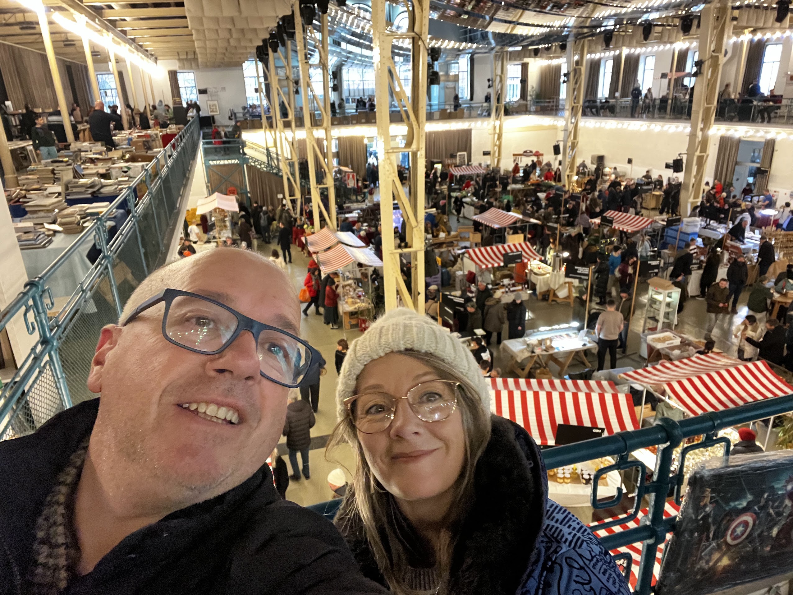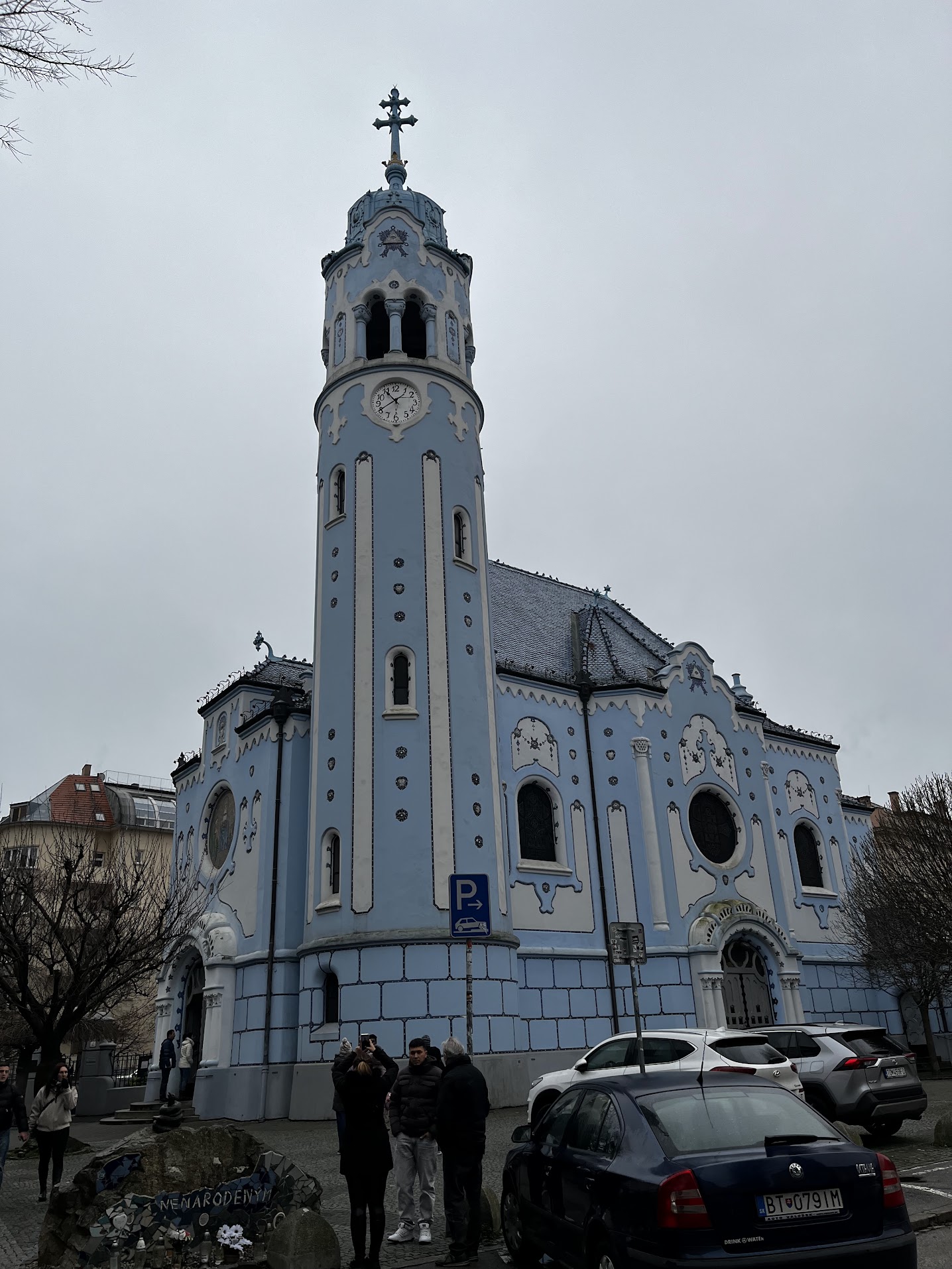 Solo teníamos la mañana del sábado para terminar de visitar Bratislava y lo primero que hicimos después de desayunar fue ir a ver la Iglesia Azul para poder contemplarla a plena luz del día. Antes, y de camino nos encontramos con un mercado tradicional de agricultores, el Old Market Hall, cuyos puestos ahora habían sido sustituidos en parte por puestos de artesanía y comida y en su parte alta un mercado de segunda mano, (ropa, pinturas, discos, etc.). Nos sorprendió que a cualquier hora del día la gente, de cualquier edad, toma vino caliente. Retomamos nuestro camino y ahora si se mostró con todo su esplendor esta iglesia con su color azul característico y su decoración modernista. Un espectáculo para la vista. No pudimos entrar puesto que se estaba celebrando un acto religioso privado, un bautizo, pero sí pudimos contemplar su belleza exterior.