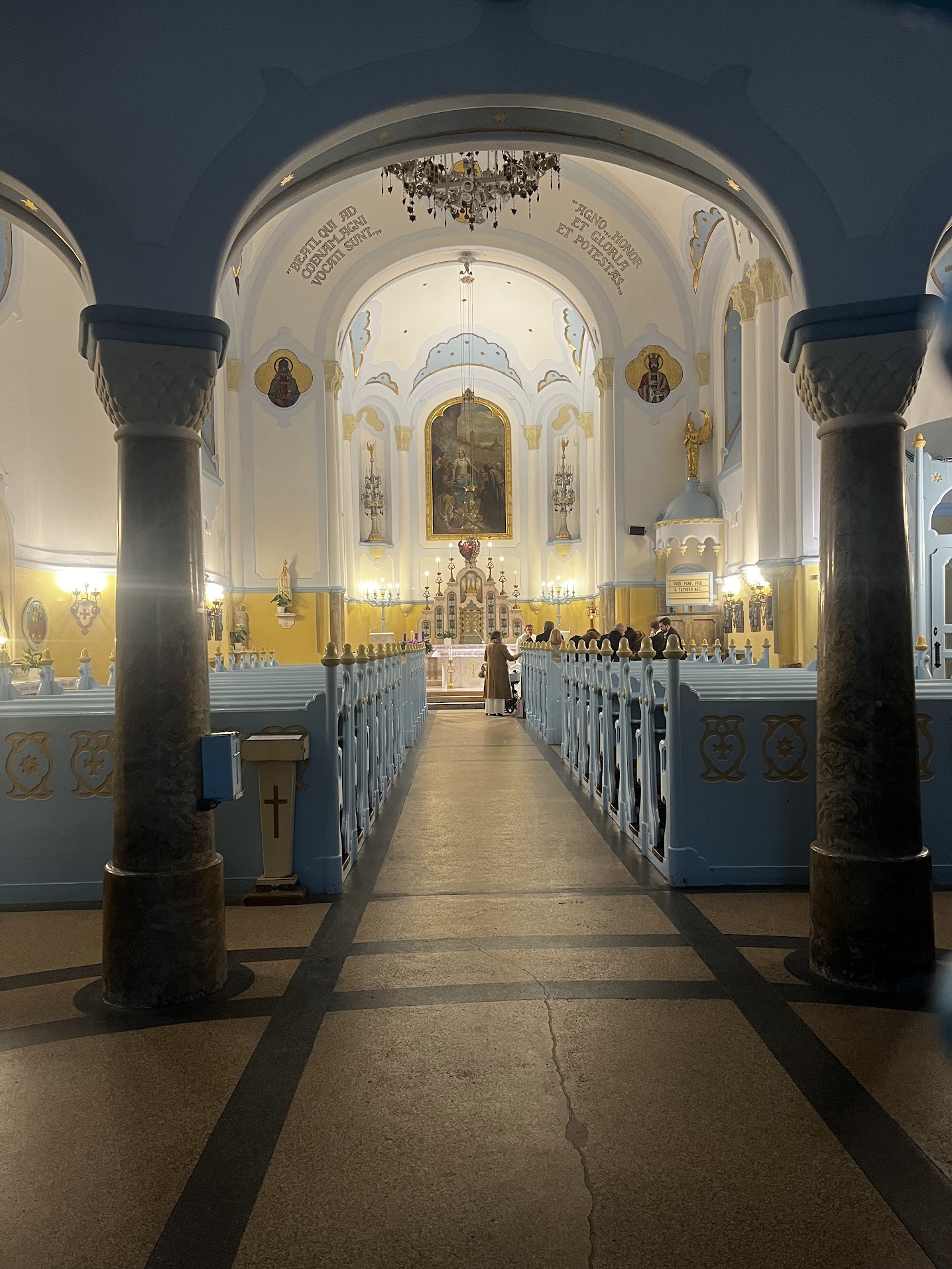Al salir decidimos encaminarnos hacia el mercadillo del Teatro Nacional, el de la Plaza Hviezdoslav, una de las plazas más importantes de la capital eslovaca. Pensábamos que era un mercadillo pequeño y resultó todo lo contrario. De ahí nos encaminamos a visitar la Iglesia de Santa Isabel, más conocida como la Iglesia Azul. Era ya noche cerrada y la iglesia no está iluminada en su exterior ni tampoco la luz de la calle era suficiente para contemplarla. Entramos en su interior, (estaban rezando el Santo Rosario), y nos quedamos muy sorprendidos al verla. El templo se construyó entre 1909 y 1913, de estilo modernista y se caracteriza por su color azul pastel y por su cubierta vidriada. El interior, también en diversos tonos de color azul y blanco, con muchos adornos modernistas y un oleo de la reina santa corona el altar principal. Realmente muy bonita. Volveríamos un par de días después a verla de día.