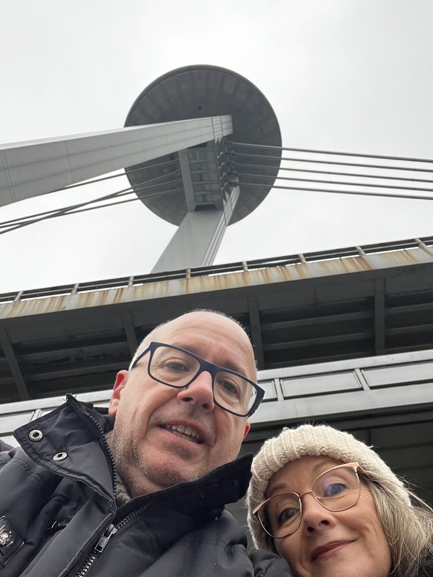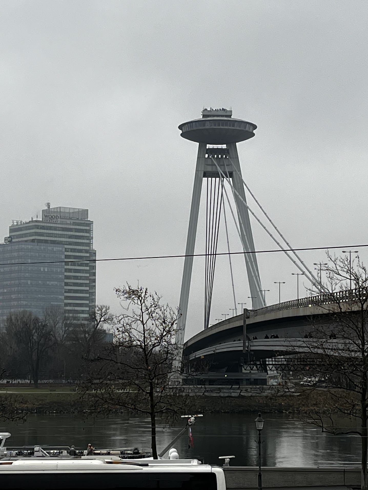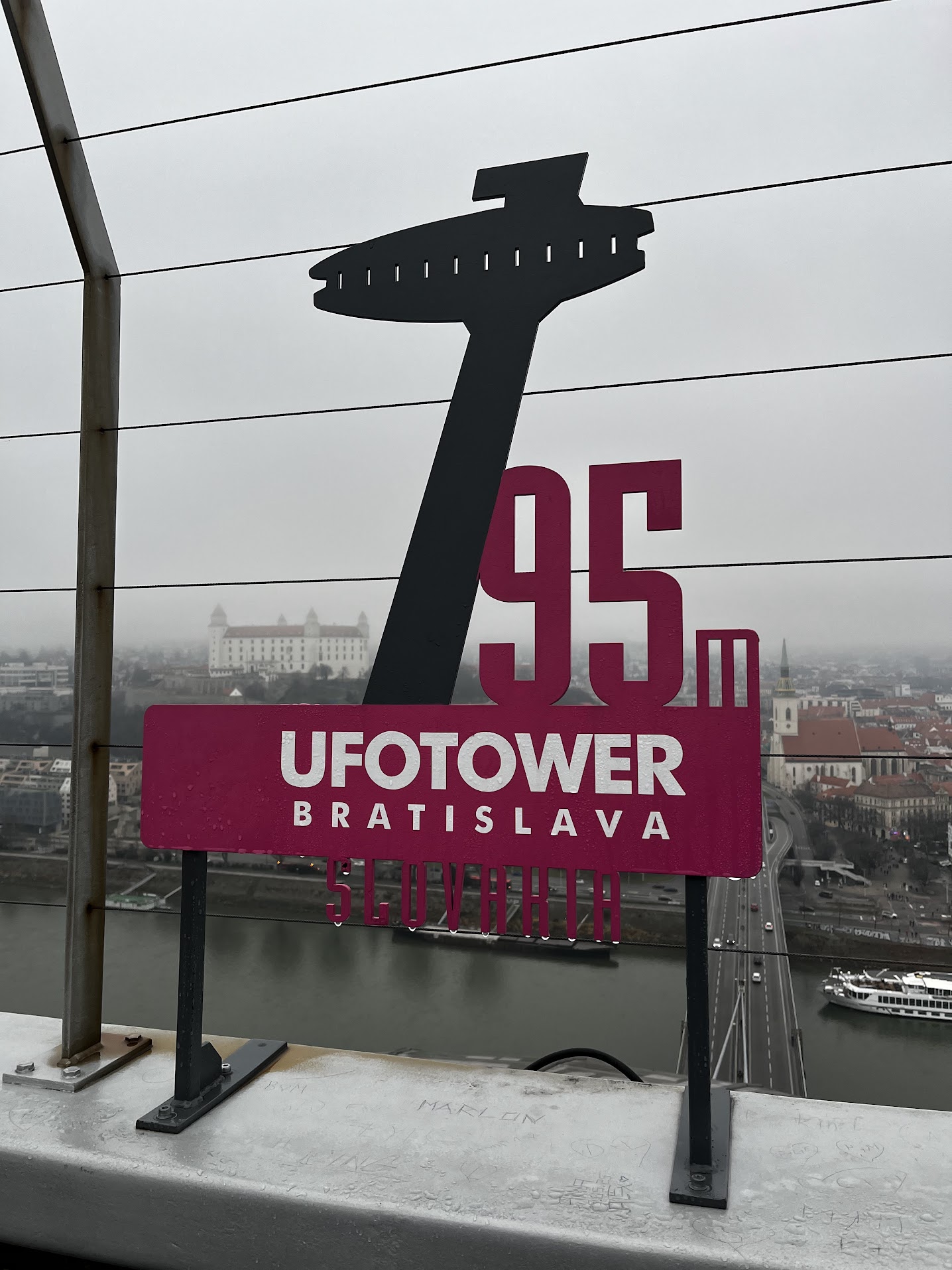 Ya la habíamos visto por dentro y ahora por fuera y nos quedaba ir al UFO. La torre que se alza en uno de los puentes que cruza el río Danubio, concretamente el Puente de la Insurrección Eslovaca, (o Puente Nuevo). El nombre de UFO le viene por su forma de ovni y se trata de una estructura con forma de platillo volante a 95 metros de altura y desde cuyo mirador se puede contemplar toda la capital eslovaca. También tiene una cafetería y un restaurante con vistas al río Danubio realmente espectaculares. La entrada cuesta 12.-€ por persona y se accede mediante un ascensor que rápidamente asciende hasta lo alto. ¿Los precios de la cafetería o del restaurante? Baratos no son, por poner un ejemplo, un café solo 6.-€.