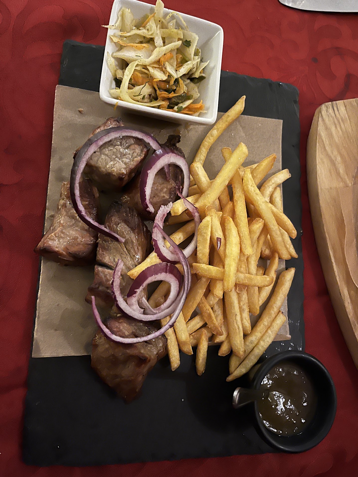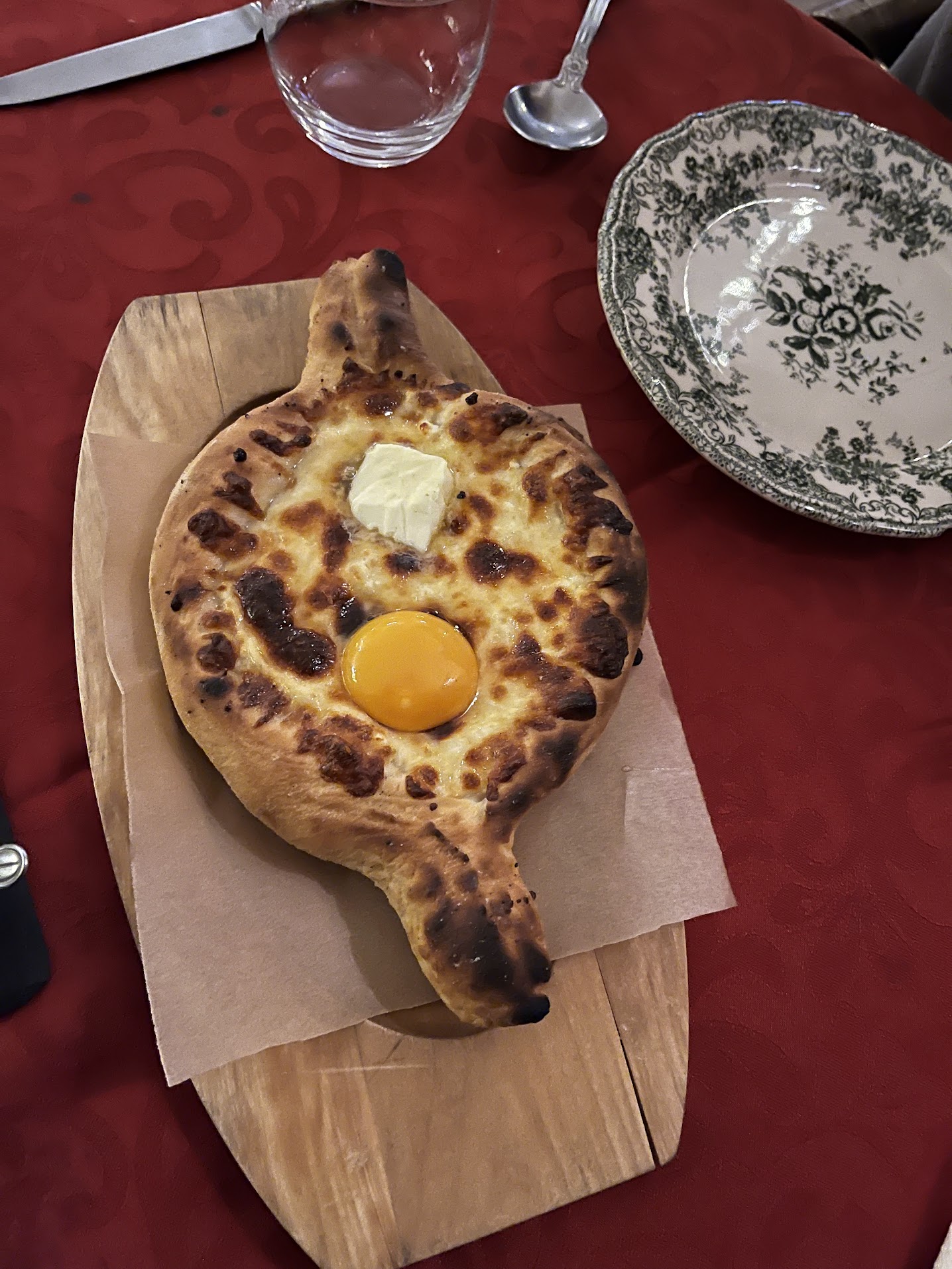 Llegamos a nuestro apartamento y justo enfrente teníamos un bonito restaurante de comida georgiana y allí que nos metimos. El Pirosmani’s Samovar es un restaurante georgiano, delicadamente decorado, con música de piano y con un servicio y una comida excelente, y además económico. Solo dos platos pedimos para compartir, (la comida es contundente, calórica y saciante), primero un Adzarske Chacapuri, un masa parecida a la de la pizza, y cuyo centro se rellena de queso fundido y sobre el que se echa mas queso de cabra una yema de huevo. Todo esto se revuelve y resulta un plato espectacular. Después nos sirvieron un Gril z Bravcovych Rebier, carne de cerdo a la parrilla con verduras, muy muy bueno, y por supuesto todo esto acompañado de cerveza típica tanto eslovaca como georgiana.